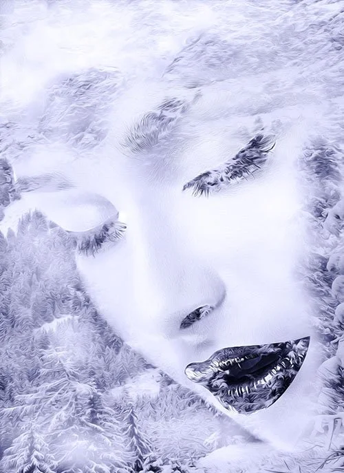 Design Process: Merged 3 images (lady’s face, snow-covered mountain and forest) to create an illusion of an emerging woman’s face at rest.
