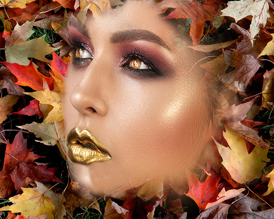 Design Process: Merged 2 images (lady’s face, autumn leaves) to create an illusion of the woman emerging through the leaves.