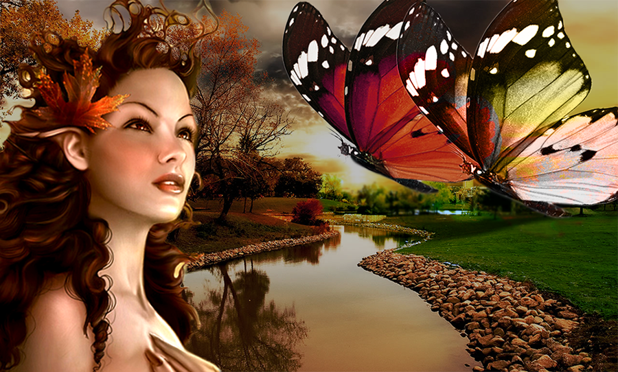 Design Process: Merged 3 images (woman, butterflies, backdrop) to create the illusion of a chance face-to-face encounter between fall and spring.