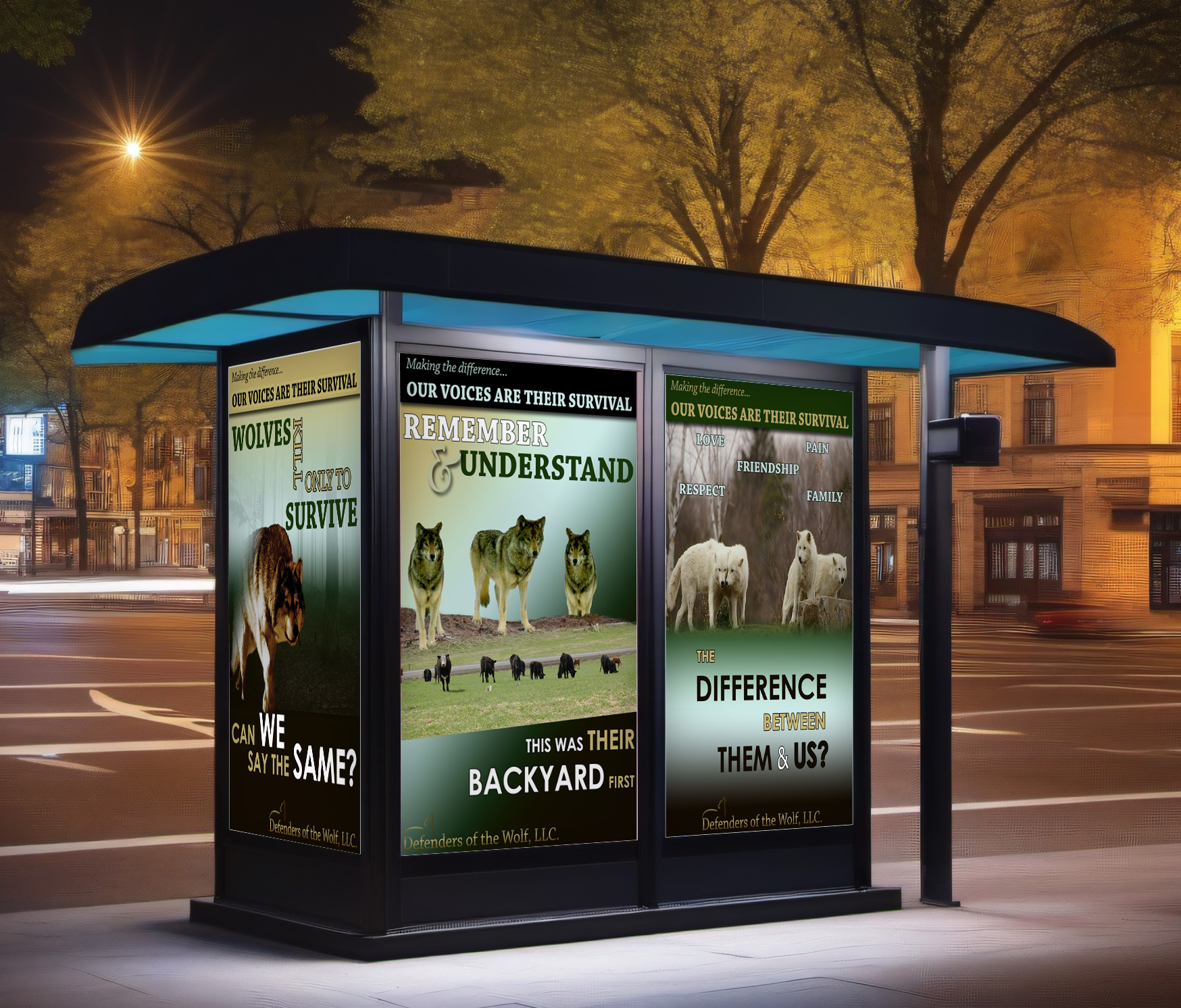 Design Process: Each poster was created to represent the organizations overall mission: to enhance public awareness and provide behavioral and balanced information. Posters offer a look into the wolf, the wolf pack and its behavioral similarities to the human race in hopes that we will educate ourselves to prevent future human reckless behaviors while learning ways to peacefully co-exist.