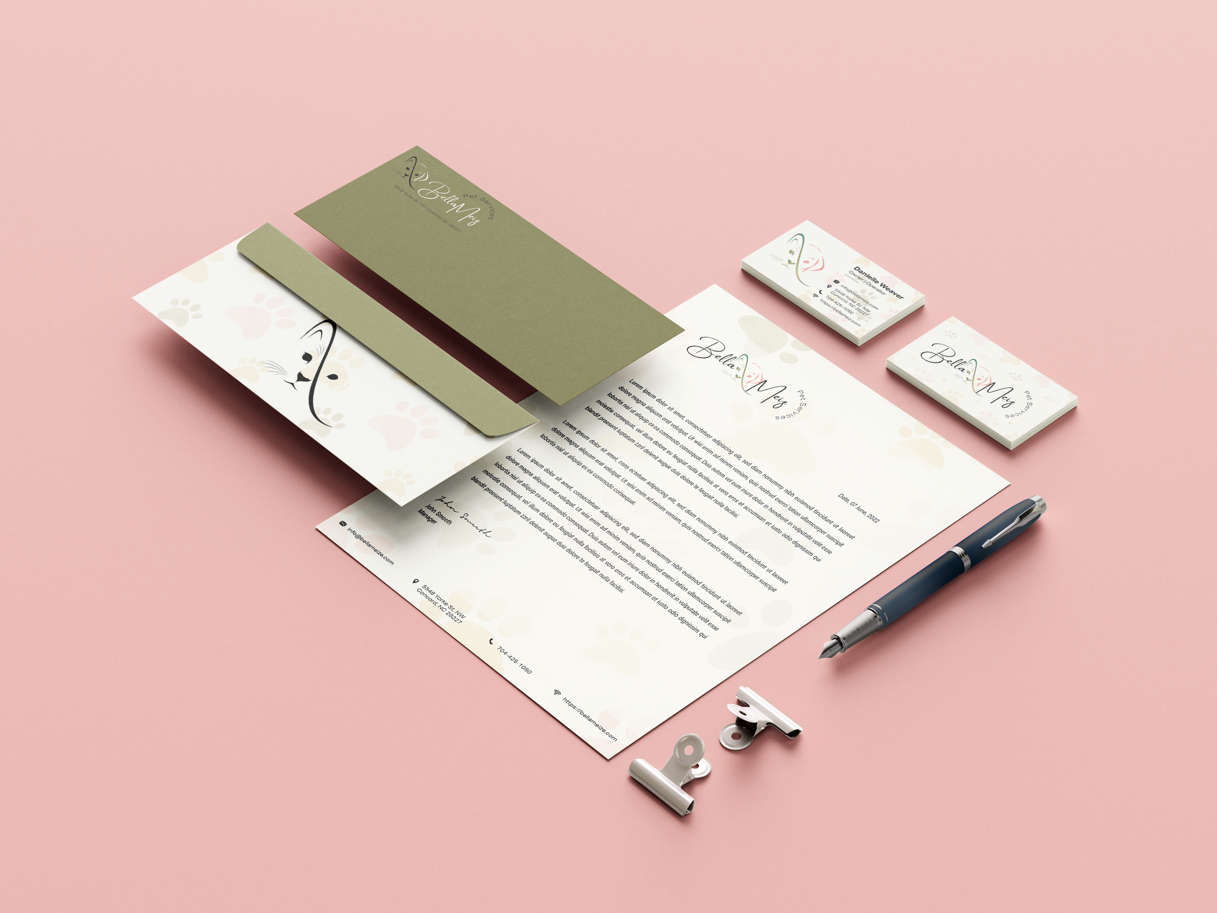 Brand System includes: Business Letterhead; Full-color Business Card (front & back); Business Envelope (front & back). Not pictured here: Invoice in fillable PDF format.
